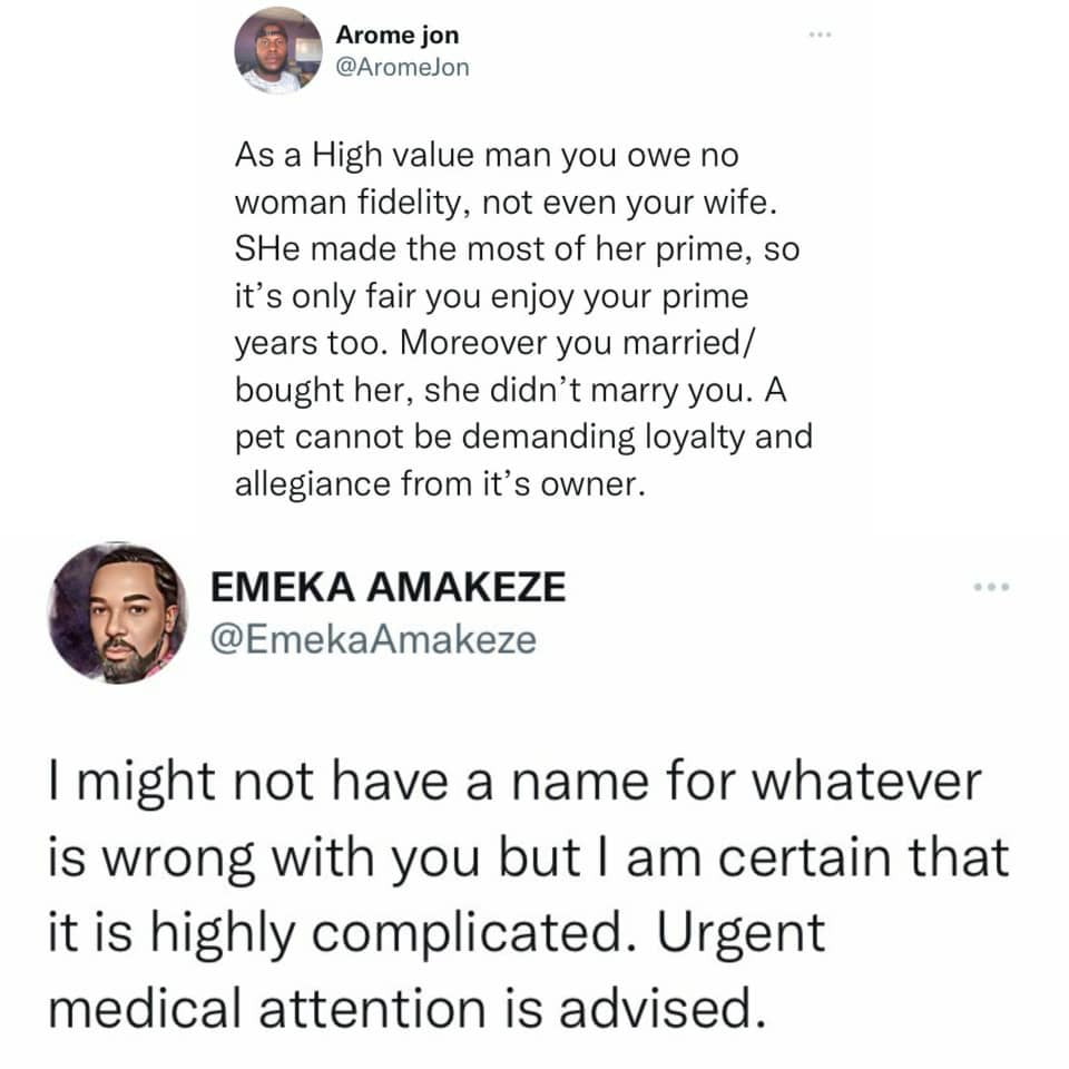 Actor Emeka Amakeze has responded to a Twitter user who shared a highly misogynistic tweet.