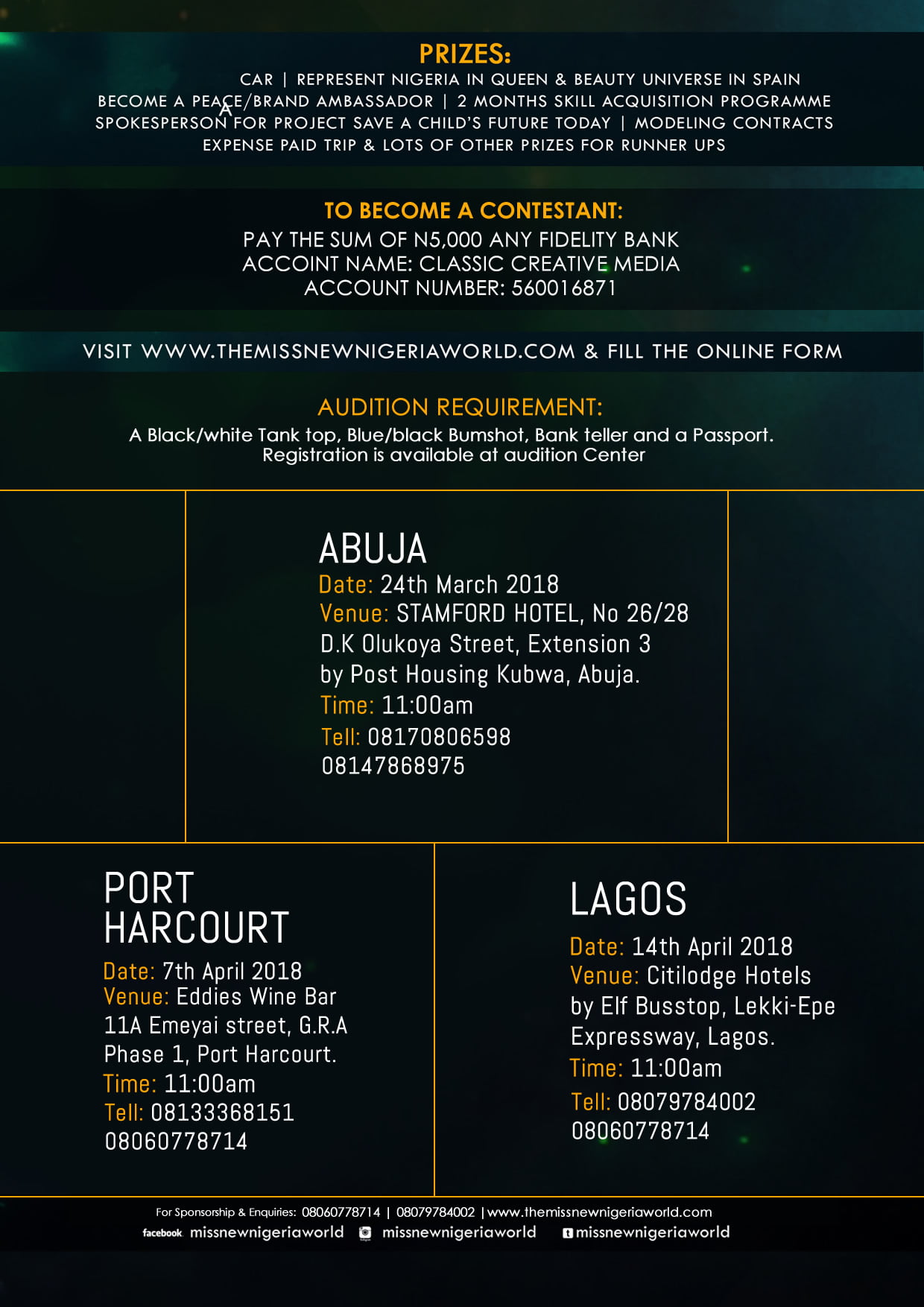 For further enquiries, Clarification and Sponsorship, Please contact 08060778714, 08079784002 or send an email to Missnewnigeriaworld@gmail.com