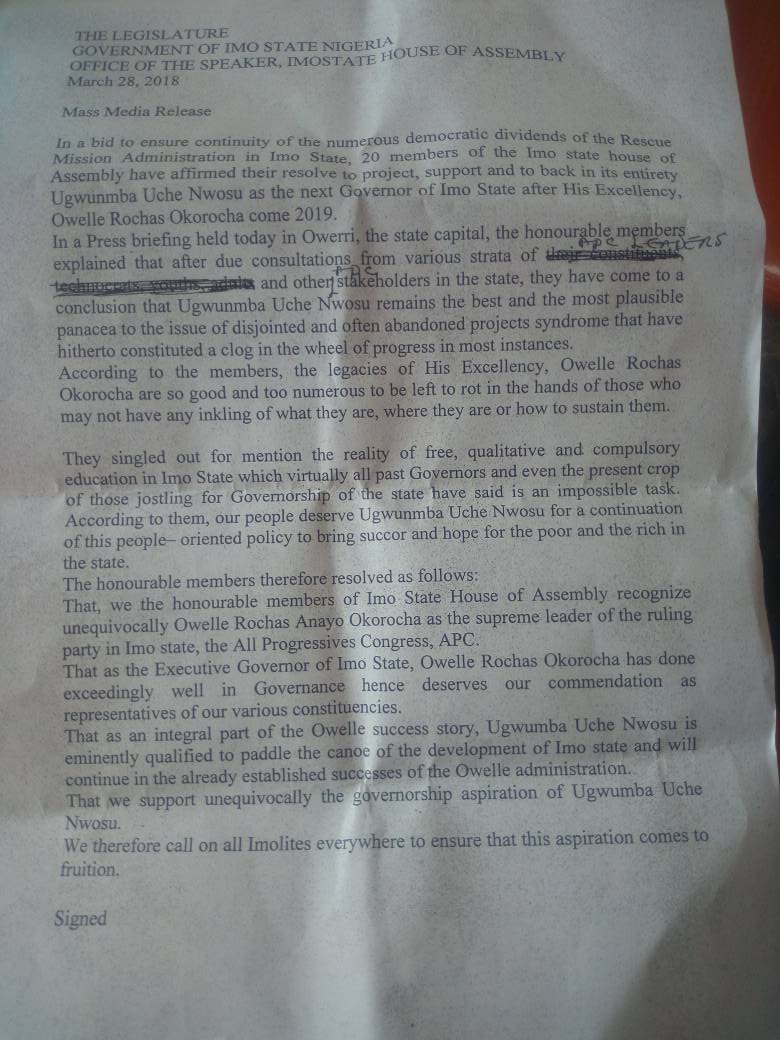 According to the Speaker, “in a bid to ensure continuity of the numerous democratic dividends of the Rescue Mission Administration in Imo State, 20 members of the Imo State House of Assembly have affirmed their resolve to project, support and back in its entirety Ugwumba Uche Nwosu as the next governor of Imo State after His Excellency, Owelle Rochas Okorocha come 2019”.