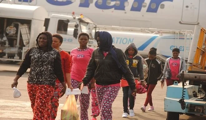 A batch of 218 Nigerians, which included seven pregnant women on Tuesday voluntarily returned from the volatile North African country of Libya where they had been stranded en-route Europe.