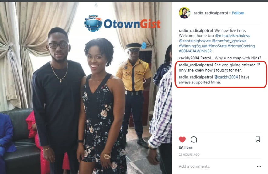 Zanders FM Owerri presenter Petrolina, who was a ‘Nina Warrior’ during the just concluded BBNaija 2018 has revealed that she opted for Miracle rather Nina who was giving attitude when it was time to take pictures.