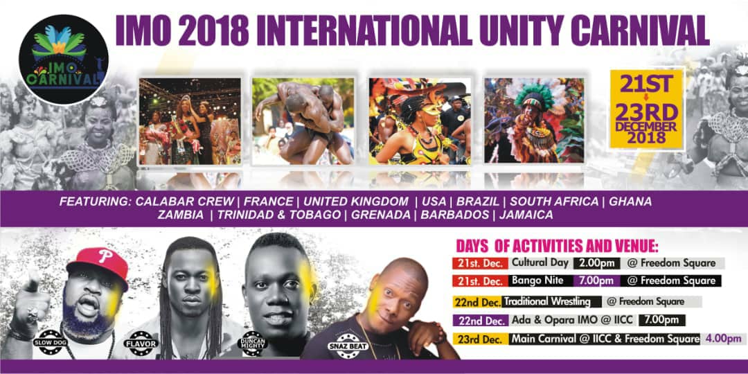 Imo State Nigeria invites all and sundry to the Imo 2018 International Carnival with the theme UNITY from the 21st to the 23rd of December, 2018.