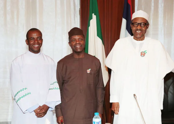 PRESIDENT BUHARI RECEIVES REV FR MBAKA. 2A. R-L; President Muhammadu Buhari, Vice President Prof Yemi Osinbajo and Rev Father Mbaka during an audience with President Buhari at the State House. DEC 18 2015.