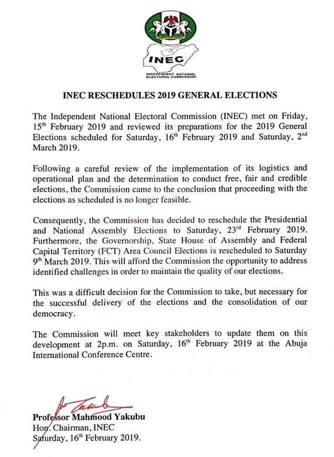 Herein is the statement issued by Chairman of INEC, Professor Mahmood Yakubu