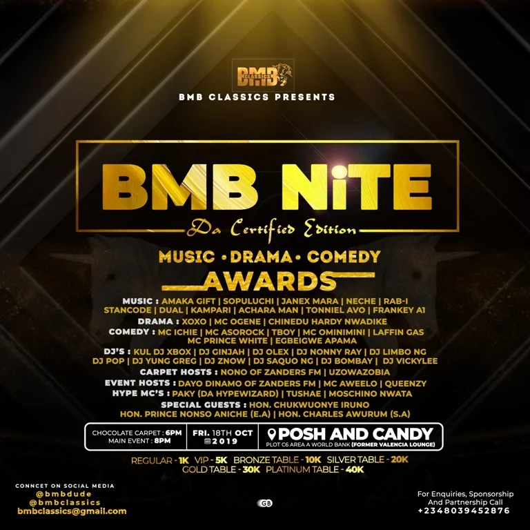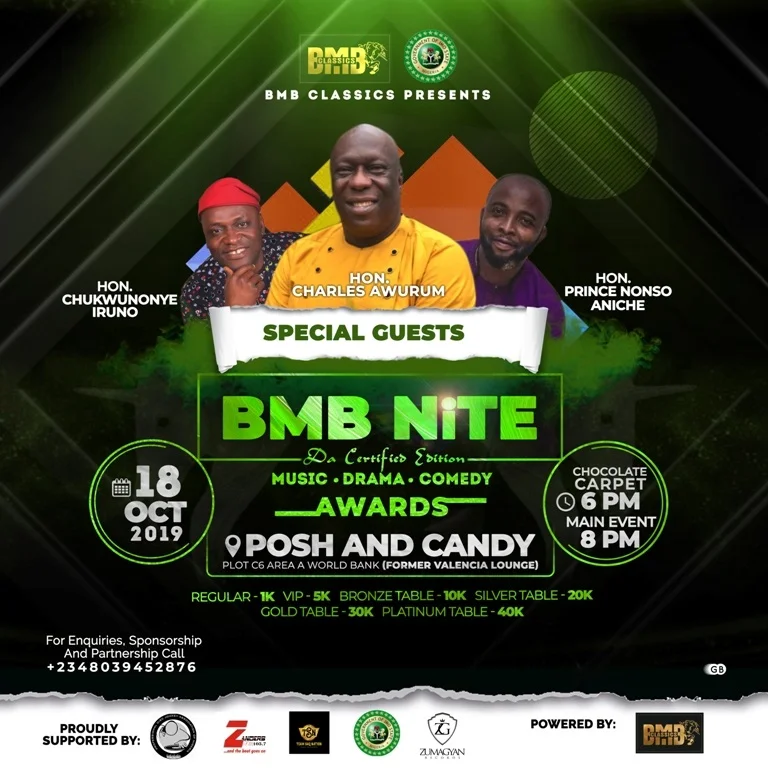 “BMB Nite is designed to celebrate the entertainment industry; it is one night of super-packed multi-genre entertainment and this first edition will be starting with awards; we hope to honour strong organizations and individuals who have helped in the growth of the entertainment industry in Imo State” DJ Blaze McBede said.
