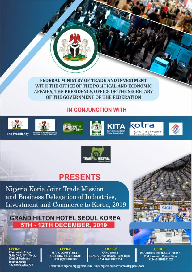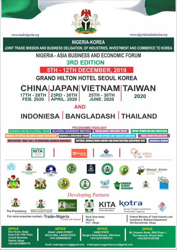 With Trade Nigeria wrapping up the year with the Korea event from December 5 to 12, 2019, the dates for other countries in 2020 has been revealed as follows: China – February 17 to 28, 2020; Japan – April 23 to 30, 2020; Vietnam – June 25 – 30, 2020 and Taiwan – July 26 to 29, 2020.