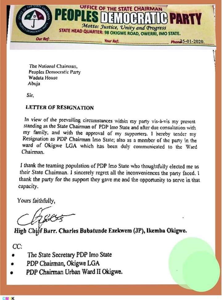 “in view of the prevailing circumstances within my party, vis-a-vis my present standing as the state chairman of Imo State PDP and after due consultation with my family and the approval of my supporters, I hereby tender my resignation as PDP Chairman Imo State, also as a member of the party in the ward of Okigwe LGA, which has been duly communicated to the Ward Chairman”, a letter published in some local dailies in Imo State read.