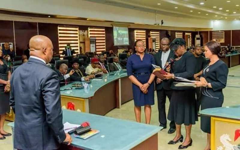 Justice Agugua’s swearing-in ceremony took place yesterday, at the Sam Mbakwe Expanded Exco Chambers at 9:00am.