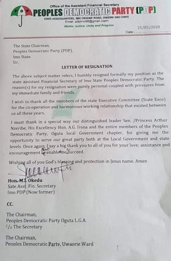 The state Assistant Financial Secretary of the Imo State Peoples Democratic Party, PDP, Maximian Okedu, on Monday has resigned.