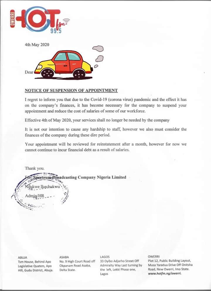 The letter shared cited the hardship caused by Covid-19 as the reason for their suspension, while another press release signed by Mr. Jacob Okonkwo on May 30, 2020 said that some staff were suspended because of their involvement in an ongoing investigation in company.
