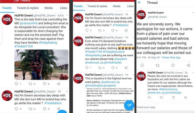 Hello all, this is Princessa and Ice Candy former HotFM staff; responsible for the now viral tweets from this account; we would like to use this medium to apologise for any and all embarrassment we’ve caused the firm. We acted from a place of emotion. (Thread) #TheMatters pic.twitter.com/rzpieDPtYZ— HotFM Owerri (@HotFM_Owerri) May 30, 2020