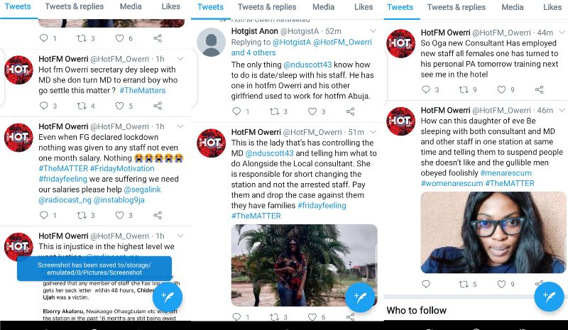 Earlier on May 29, 2020, the hijacked account posted tweets accusing staff of Hot Fm Owerri by name Ngozi of having multiple affairs with both the MD, Consultant and other staff adding that she was the one who ordered their suspension.