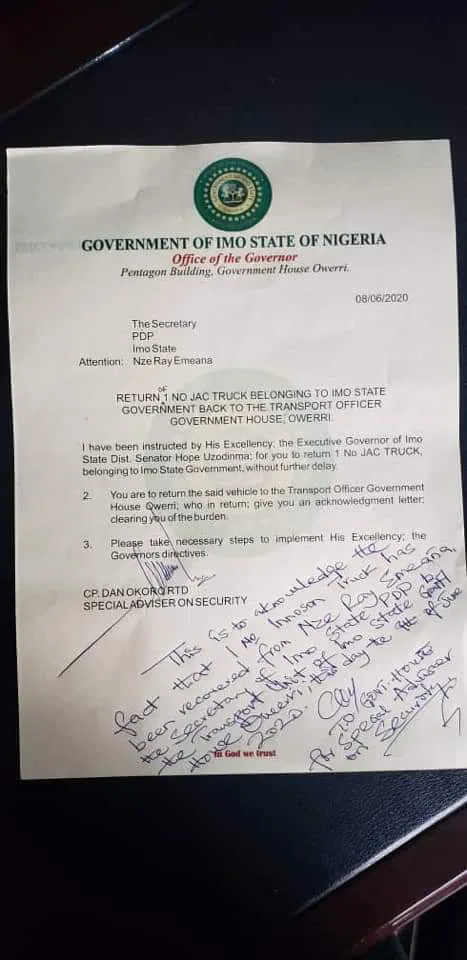 “I have been instructed by His Excellency, the Executive Governor of Imo State Dist. Senator, Hope Uzodinma; for you to return 1 No JAC Truck, belonging to Imo State Government, without further delay.