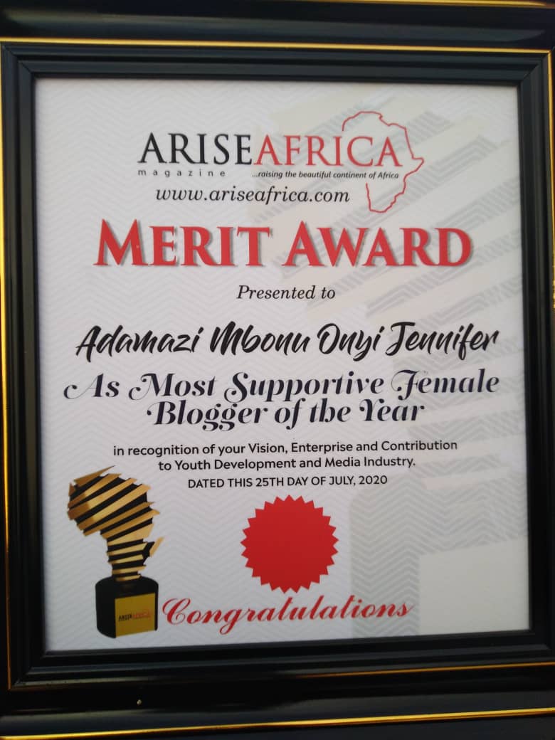 Mbonu Onyi Jennifer, the Creative Director of Adamazi Media has been awarded the most supportive female blogger of the year 2020.