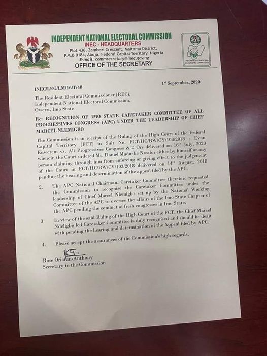 INEC in a letter dated September 1, 2020 and addressed to the Resident Electoral Commissioner in Imo State and signed by Rose Orafian- Anthony, Secretary of the Commission, said “in view of the said Ruling of the High Court of the FCT, the Chief Marcel Nlemigbo led Caretaker Committee is duly recognized and should be dealth with pending the hearing and determination of the Appeal filed by the APC”