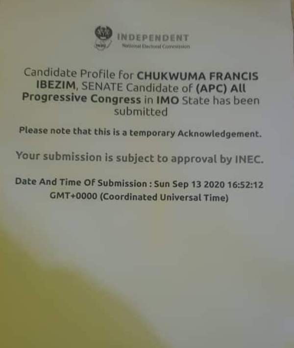 The Independent National Electoral Commission, INEC, has listed Frank Ibezim, as candidate of the All Progressive Congress, for Okigwe senate bye election.