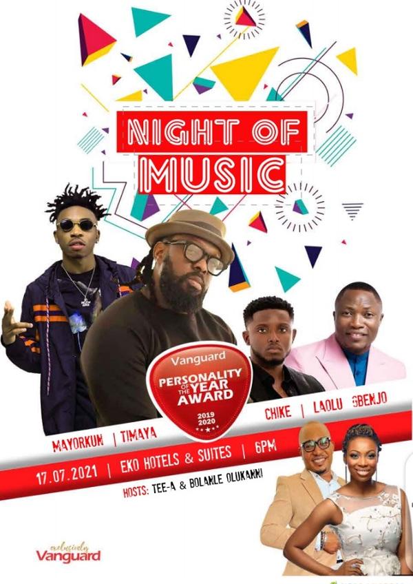 The annual Vanguard Personality of the Year Awards which comes up Saturday, July 17, 2021 at Eko Hotel and Suites has been tagged as a“Night of Music” as top musical acts like Timaya, Mayorkun and Chike are set to thrill guests with their superb musical renditions.