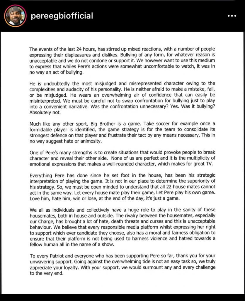 The statement read: “The events of the last 24hours has stirred up mixed reactions with a number of people expressing their displeasures and dislikes. Bullying of any form for whatever reason is unacceptable and we do not condone or support it. We however want to use this medium to express that whiles Pere’s actions were somewhat uncomfortable to watch, it was in no way an act of bullying.