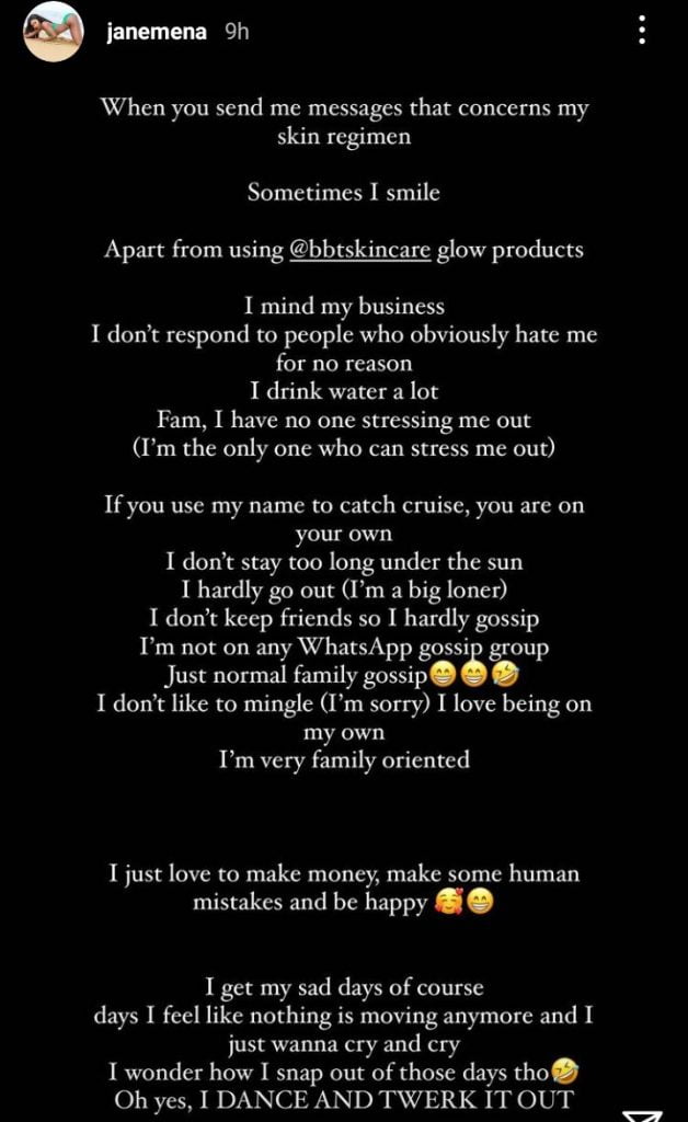 Popular instagram twerker jane mena has replied tonto dikeh with a sub, she wrote on her instagram story “If you use my name to catch cruise, you are on your own”, she wrote this hours before Tonto Dikeh alerted her that her ex, Prince Kpokpogri, has her sex tapes