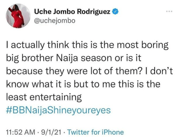 “I actually think this is the most boring Big Brother Naija season or is it because they were a lot of them? I don’t know what it is, but to me, this is the least entertaining #BigBrotherNaijaShineYaEye,” she tweeted.
