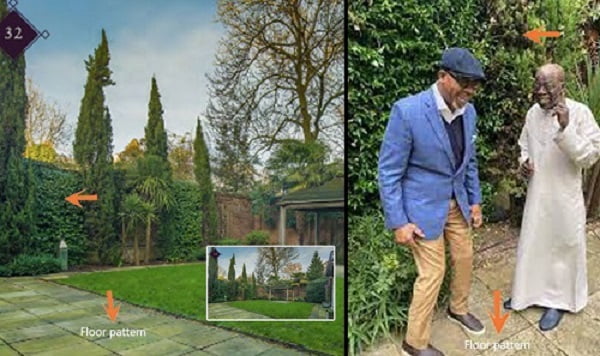 In another photo, Messrs. Abiodun and Tinubu were captured having what seemed like a hearty laugh. A comparison of the concrete rectangular concrete slabs around the garden with those of the garden in the Savills brochure showed that they are identical.
