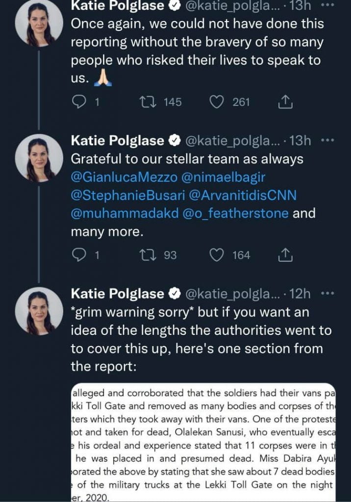 CNN reporter Katie Polglase has reacted to Lagos judicial panel’s report on the shooting at Lekki toll gate, which indicted the Nigerian army and police.