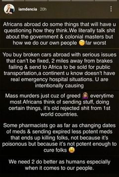 Cameroonian-born singer and entrepreneur, Dencia made a post on her Instagram story talking about Africans in diaspora and the terrible things the do to Africans at home