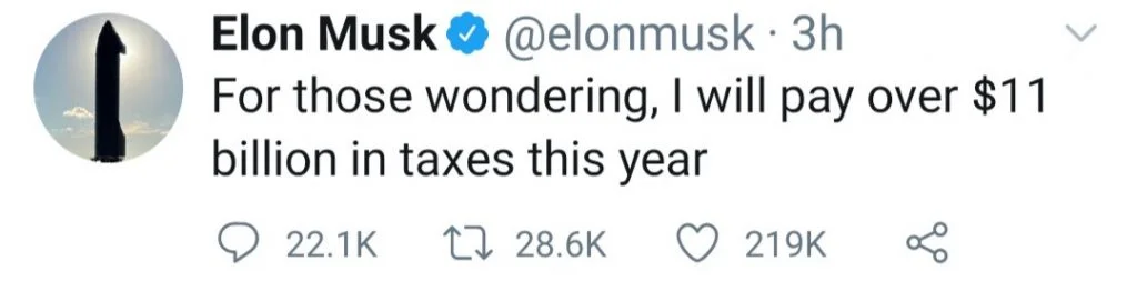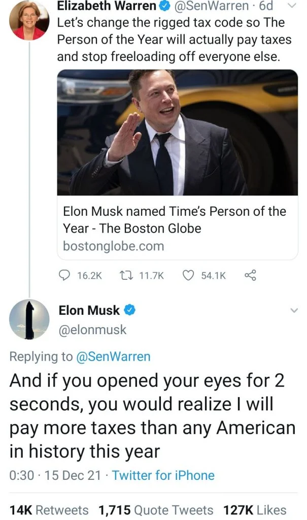 Last week, Musk said he’ll pay more taxes than any American in history this year. That was in response to another tweet from Massachusetts Sen. Elizabeth Warren, who used Musk’s Time Magazine “Person of the Year” accolade to call him out on his taxes.