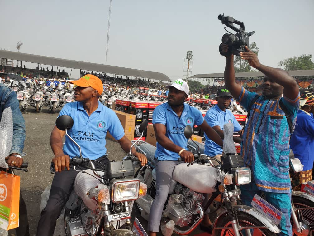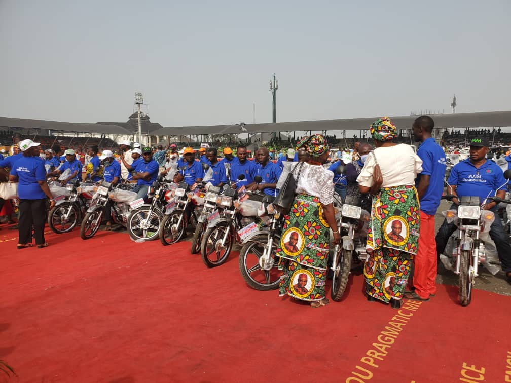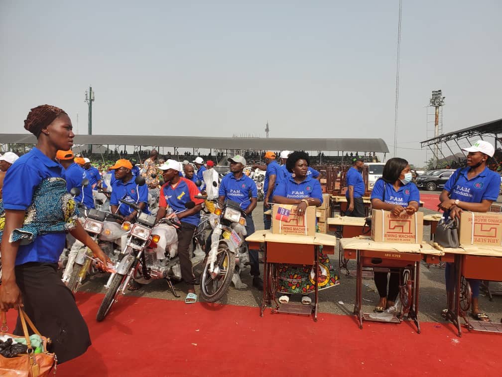 “We are giving out 300 motorcycles, 500 hair dryers, 500 sewing machines, fifty thousand naira to 1000 people among which are the widows, the indigents and small scale traders, 2000 bags of rice among other items.”