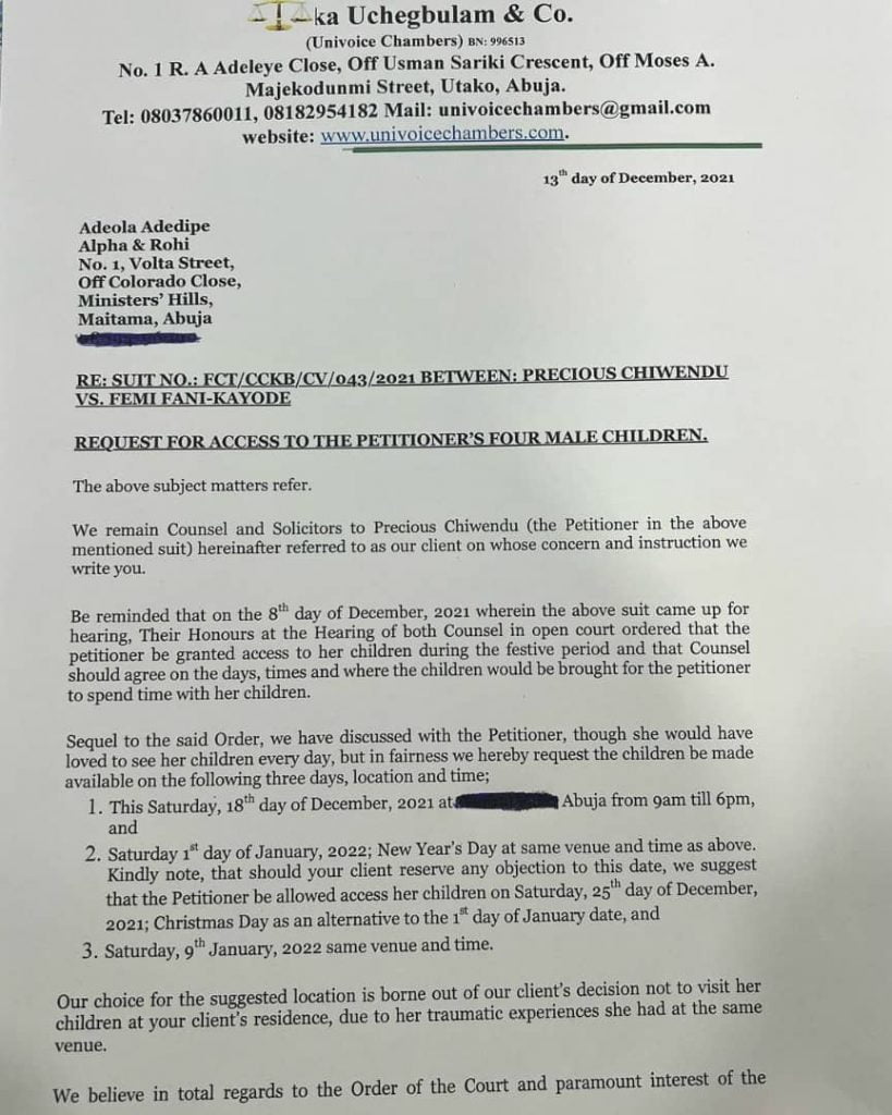 Ex-beauty queen, Precious Chikwendu, has shared a copy of the letter her lawyers wrote to her estranged husband, Femi Fani-Kayode, asking that he obeys the court order for her to see their four children, at least three times this festive period.