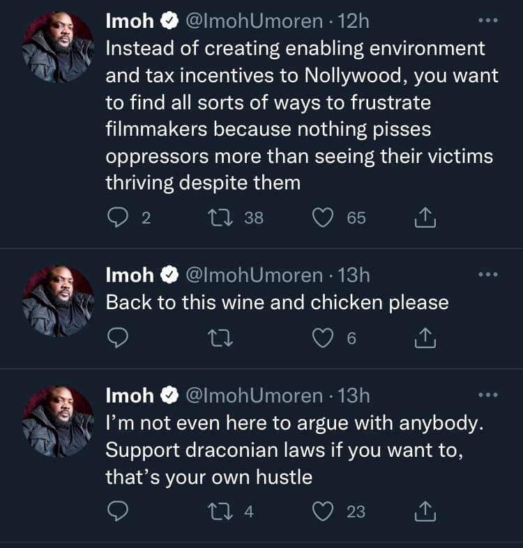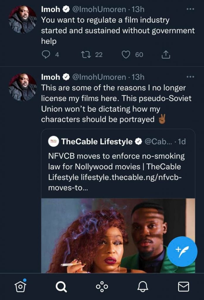 Filmmaker Imoh Umoren has taken a swipe at the National Film and Video Censors Board over its recent plan to enforce a law banning smoking in movies.