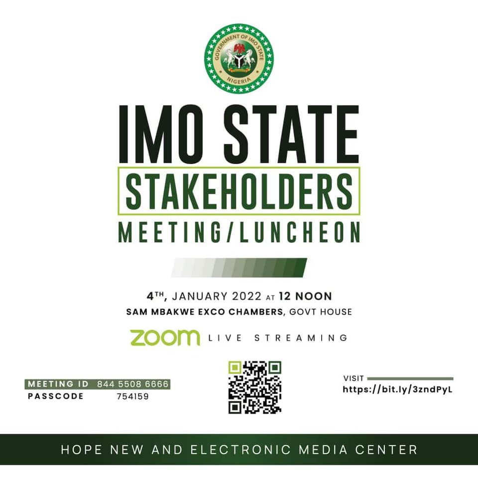 The meeting of the stakeholders which was previously scheduled to hold at Ahiajoku Convention Center in New Owerri, has been moved to the Government House’s Exco Chamber, while people are expected to join virtually via Zoom on January 4 with meeting ID 844 5508 6666 and Password 754159.