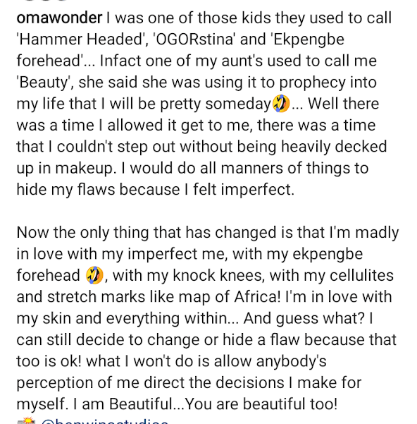 I was one of those kids they used to call ‘Hammer Headed’, ‘OGORstina’ and ‘Ekpengbe forehead’… Infact one of my aunt’s used to call me ‘Beauty’, she said she was using it to prophecy into my life that I will be pretty someday🤣… Well there was a time I allowed it get to me, there was a time that I couldn’t step out without being heavily decked up in makeup. I would do all manners of things to hide my flaws because I felt imperfect.Now the only thing that has changed is that I’m madly in love with my imperfect me, with my ekpengbe forehead 🤣, with my knock knees, with my cellulites and stretch marks like map of Africa! I’m in love with my skin and everything within… And guess what? I can still decide to change or hide a flaw because that too is ok! what I won’t do is allow anybody’s perception of me direct the decisions I make for myself. I am Beautiful…You are beautiful too!