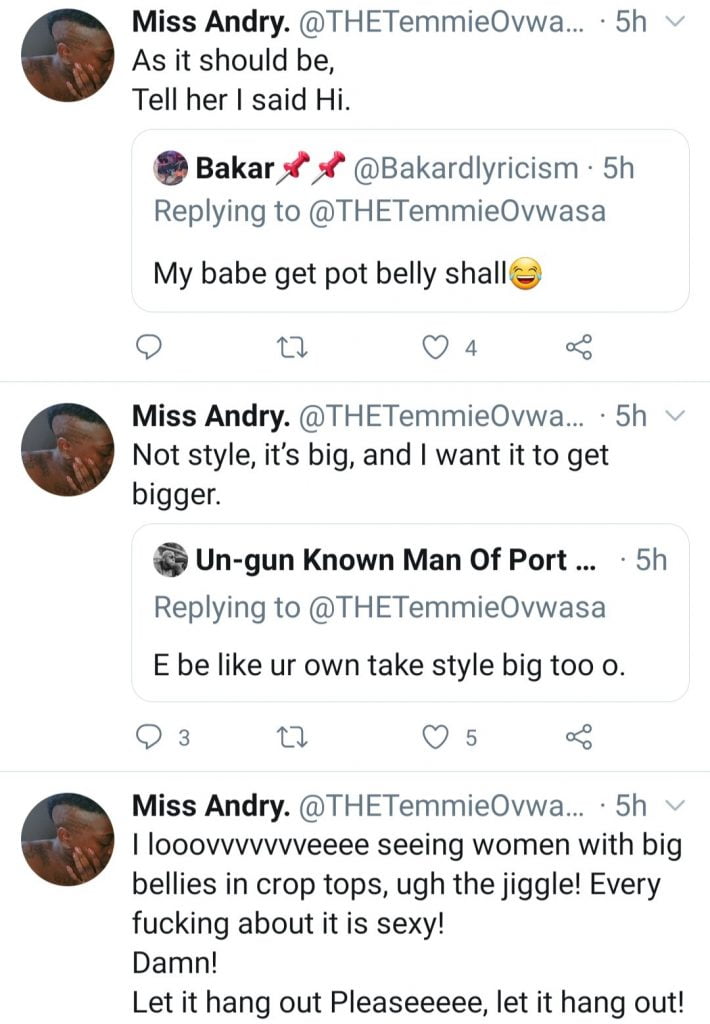 Temmie Ovwasa has said that women with big bellies look sexy when they wear crop top.