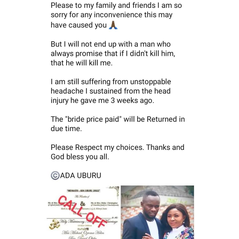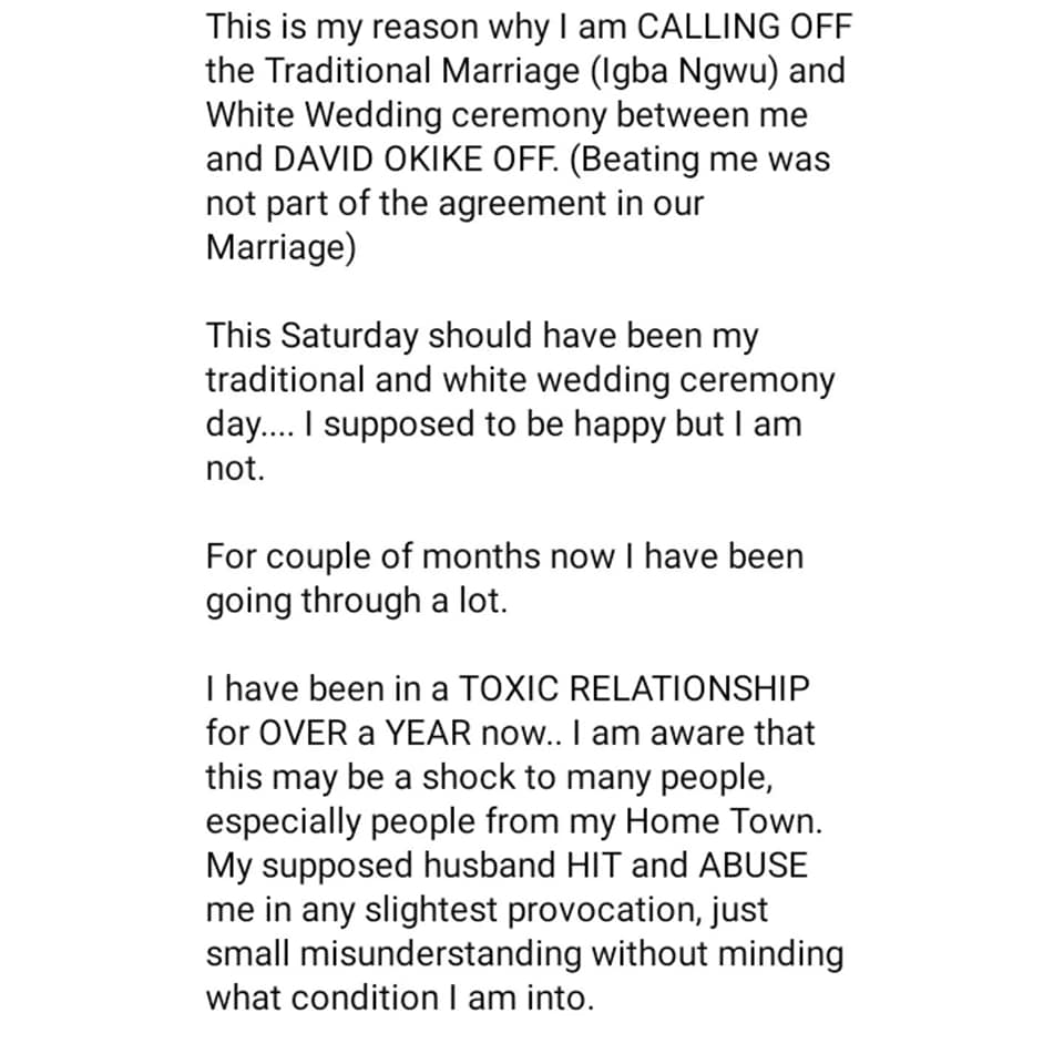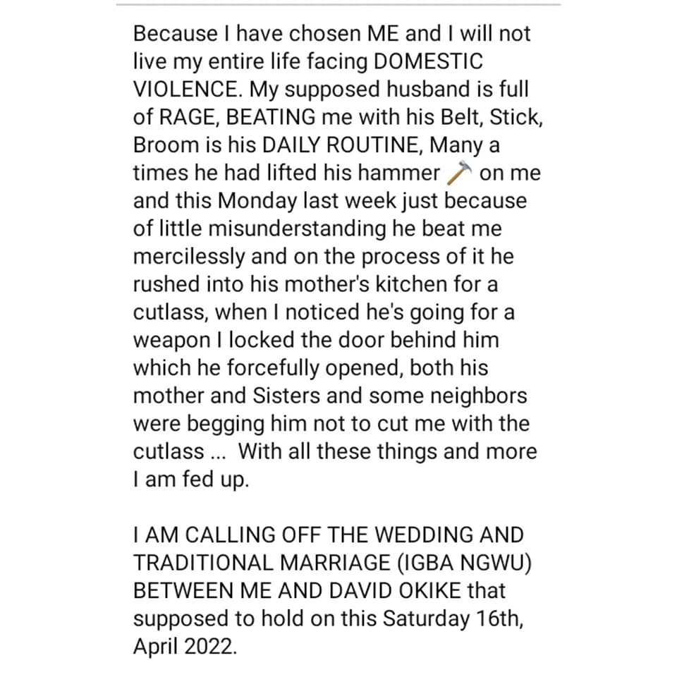 The lady yesterday took to her social media handle to declare her decision to cancel the wedding which would have held on the 15th of April 2022, between her and one Mr. David Okike.