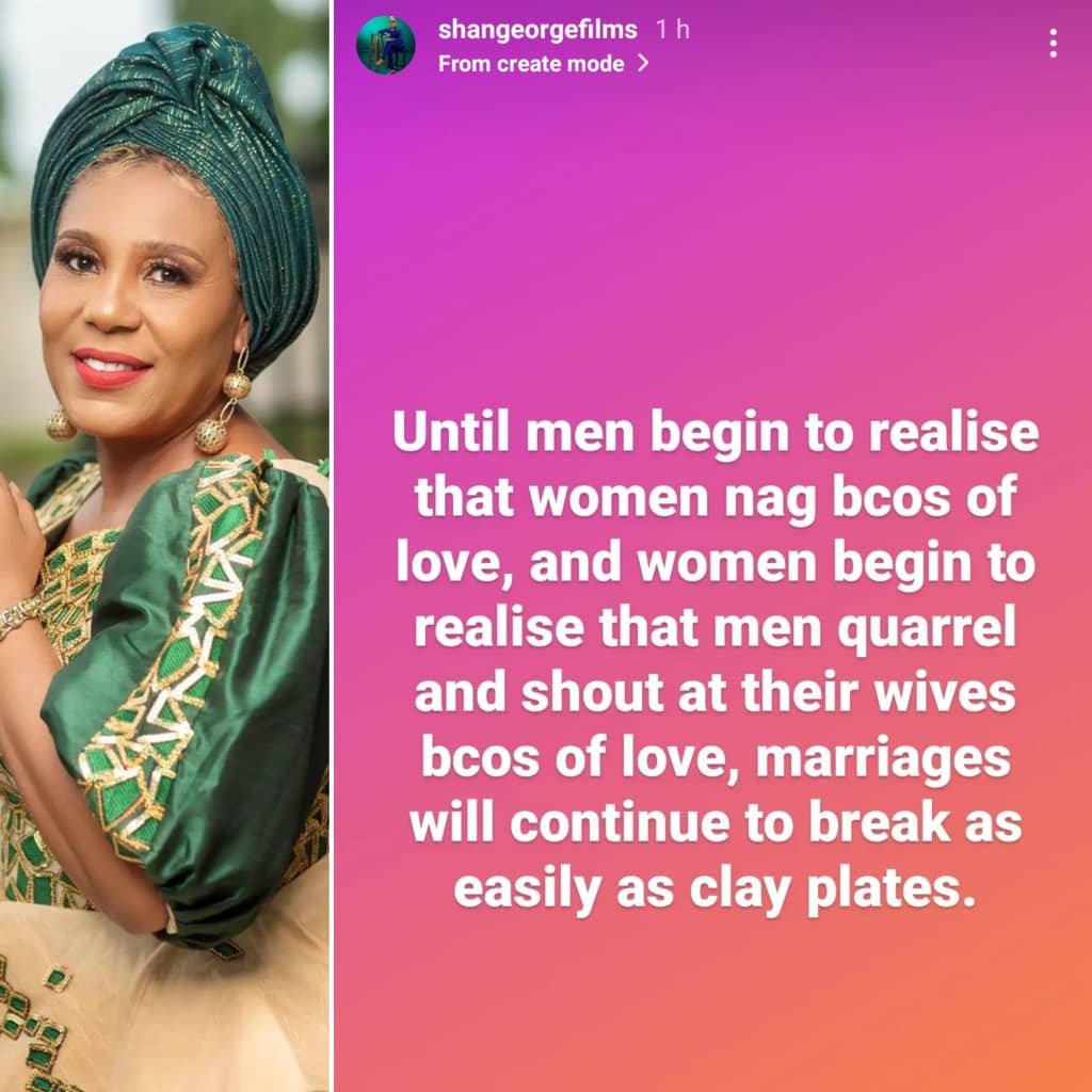Actress Sharon George took to her Instastories this morning to share her thoughts on why marriages will continue to break as easily as clay plates.