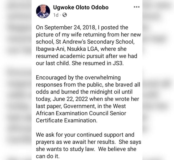 It would be recalled that Ugwoke went viral in 2018 after he announced that his wife went back to secondary school after child bearing. She had started from JSS3.
