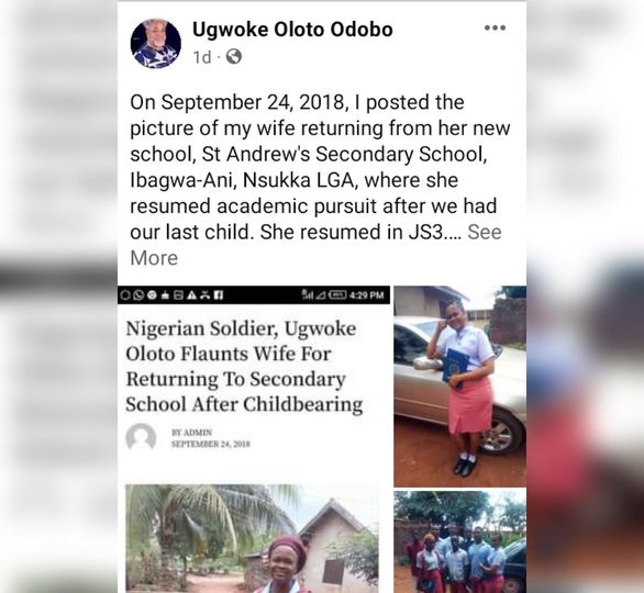 A former Weapons Instructor at the Nigerian Army, Ugwoke Oloto Odobo has celebrated his wife, Precious Chioma Ugwoke, who has just graduated from Secondary school.