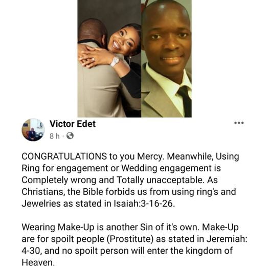 A Nigerian identified as Victor Edet has taken to social media to congratulate the duo on their recent engagement.