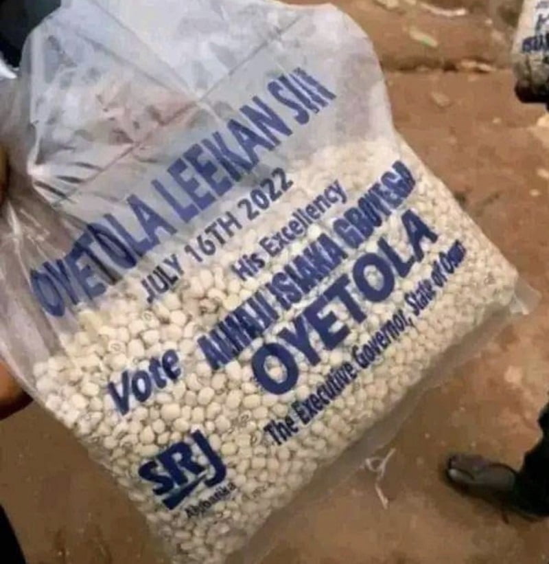 A governorship aspirant in Osun state identified as Oyetola shared the packaged beans as a souvenir during his campaign visit to one of the L.G.As in the state.