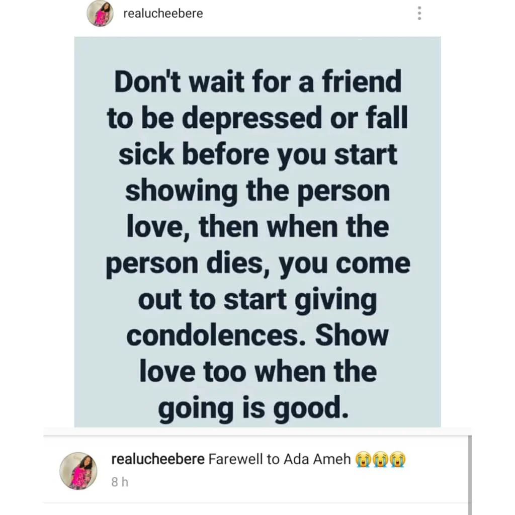 In a post she made while mourning Ameh, Uche asked people not to wait for their friends to be depressed before they show them love. See her post below…