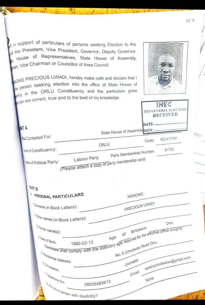 Ahead of the proposed 2023 general elections, the Independent National Electoral Commission (INEC) has cleared Labour Party candidate for Orlu state constituency Comrade Precious Nwadike, Chairman, Caretaker Committee of the Nigeria Union of Journalists, Imo State Council, among others.