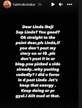 she posted on her instagram story , telling linda ikeji not to post her on her blog or instagram story