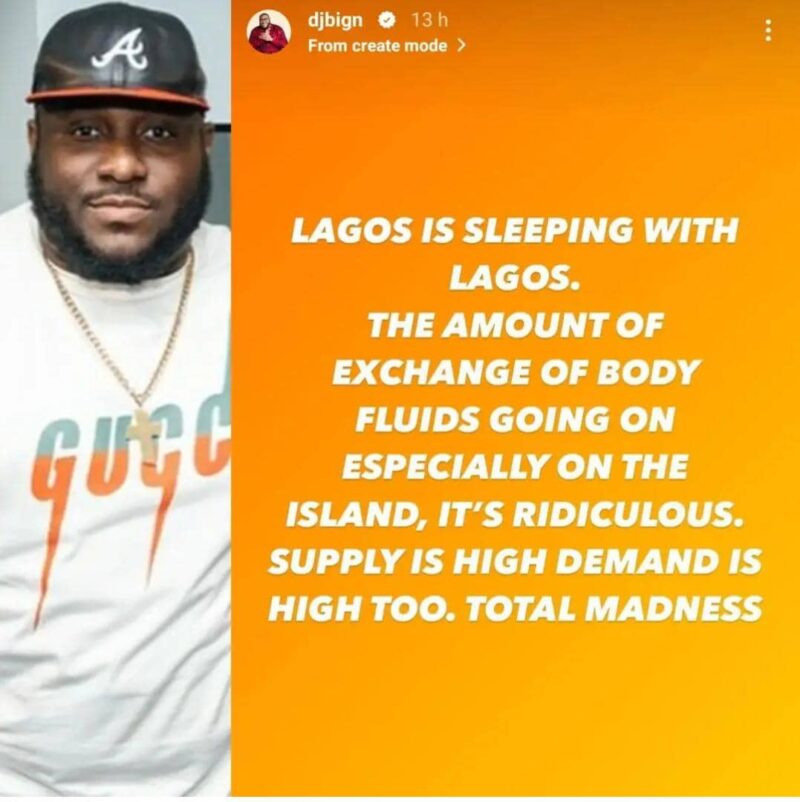 Nigerian HipHop Disc Jockey, Nonso Temisan Ajufo, known professionally known as DJ Big N, has expressed shock at the alarming rate of sexual activities going on in Lagos.