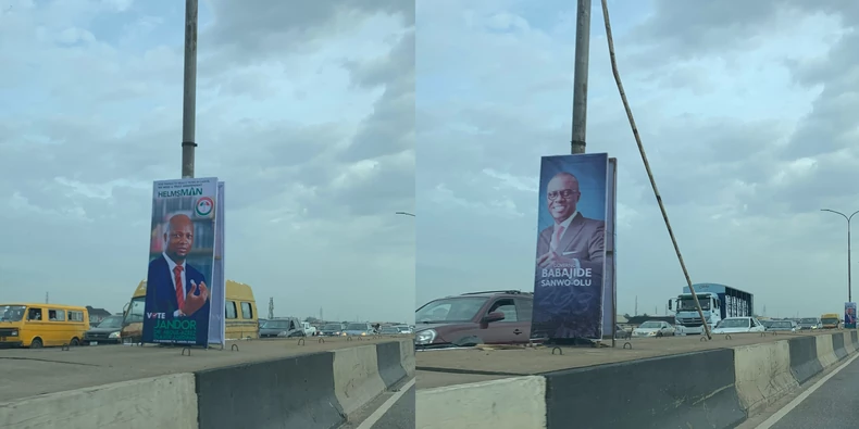 What Pulse saw: Our correspondent, on Wednesday morning, October 12, 2022, spotted Jandor’s pole-banners on each pole that preceded the posters of the All Progressive Congress candidate, and Lagos State governor, Babajide Sanwo-Olu, on the Third Mainland Bridge.