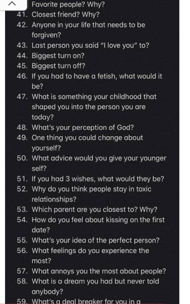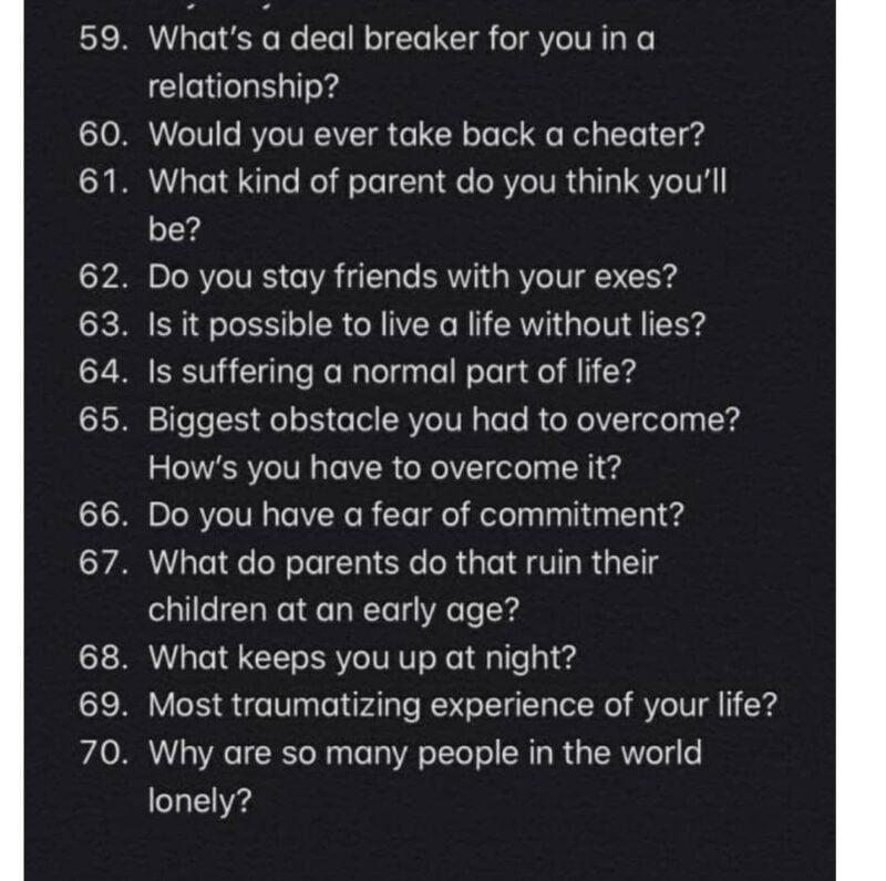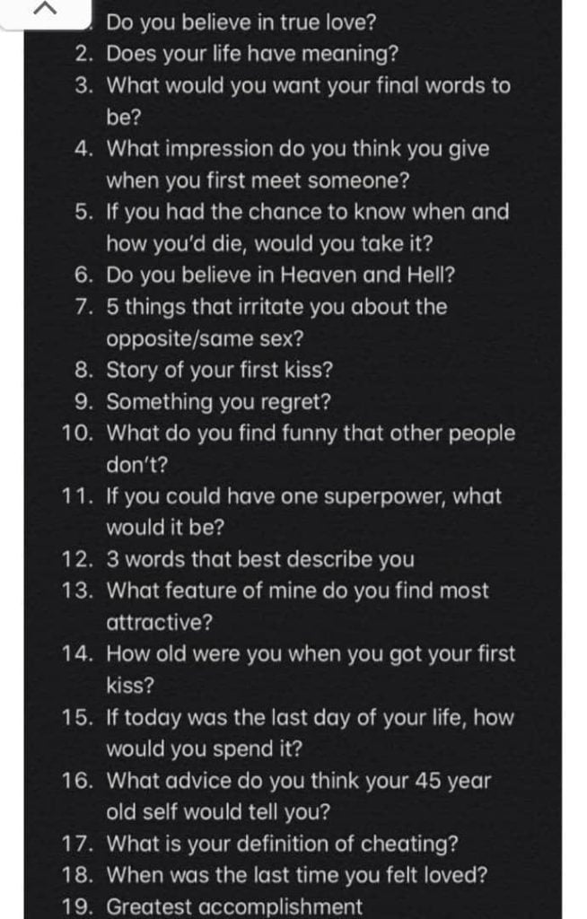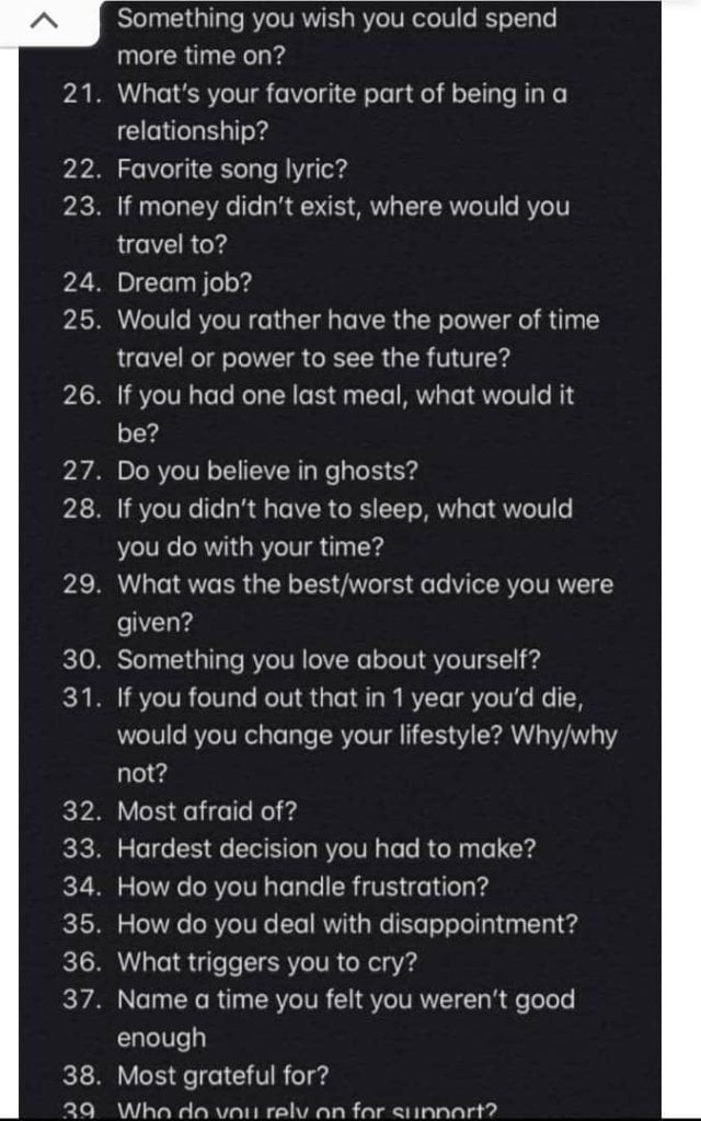 Questions like “Do you believe in Ghosts?” “Does your life have meaning?” “What is your definition of cheating?” were among some of the alternatives she shared.