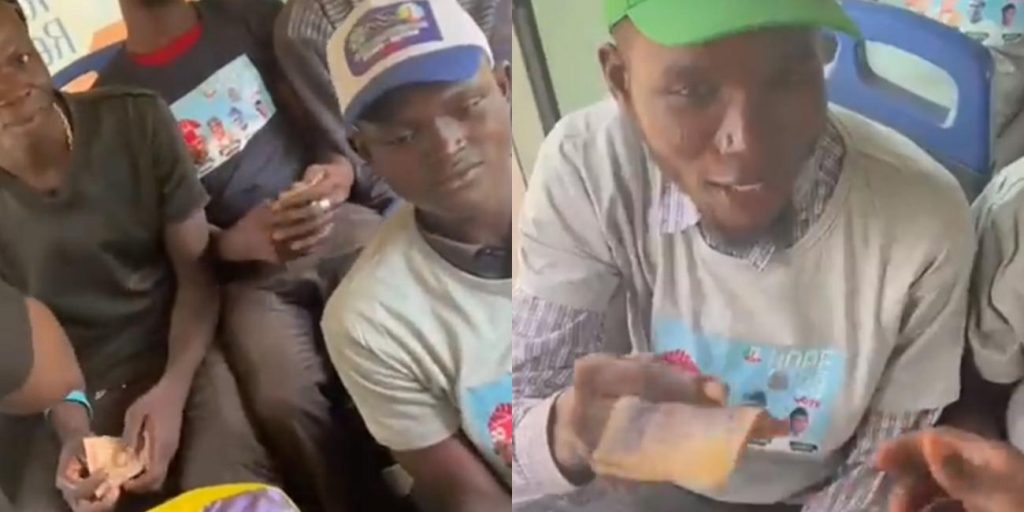 The picture which has gone viral on Twitter showed a young man sharing N1000 each in a coaster bus fully loaded with young men in different clothes and face caps customised with the photos of the APC presidential candidate, Bola Tinubu and his running mate, Kashim Shettima.
