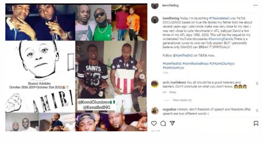 Controversial and self-acclaimed investigative journalist, Kemi Olunloyo, has alleged that there is a generational course in Davido’s family.