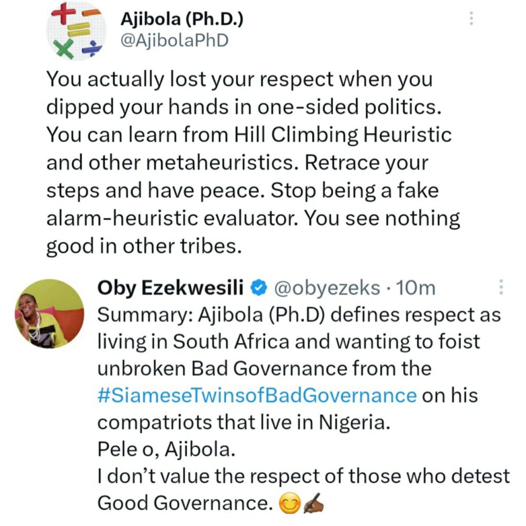 Responding, Ezekwesili pointed out that she doesn’t value the respect of those who detest Good Governance and more so it pleases her enormously that he doesn’t have respect for her.