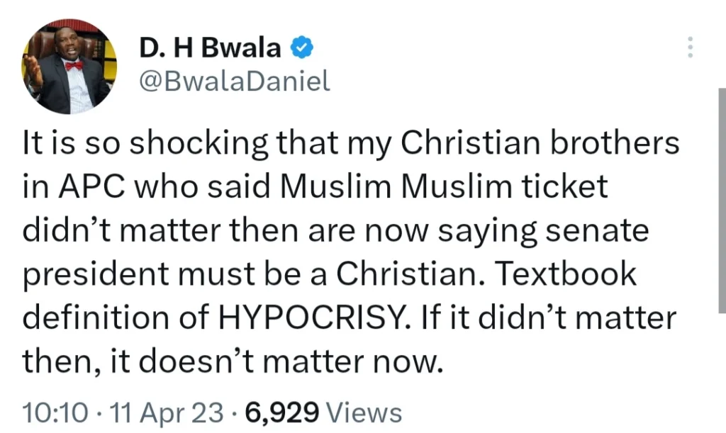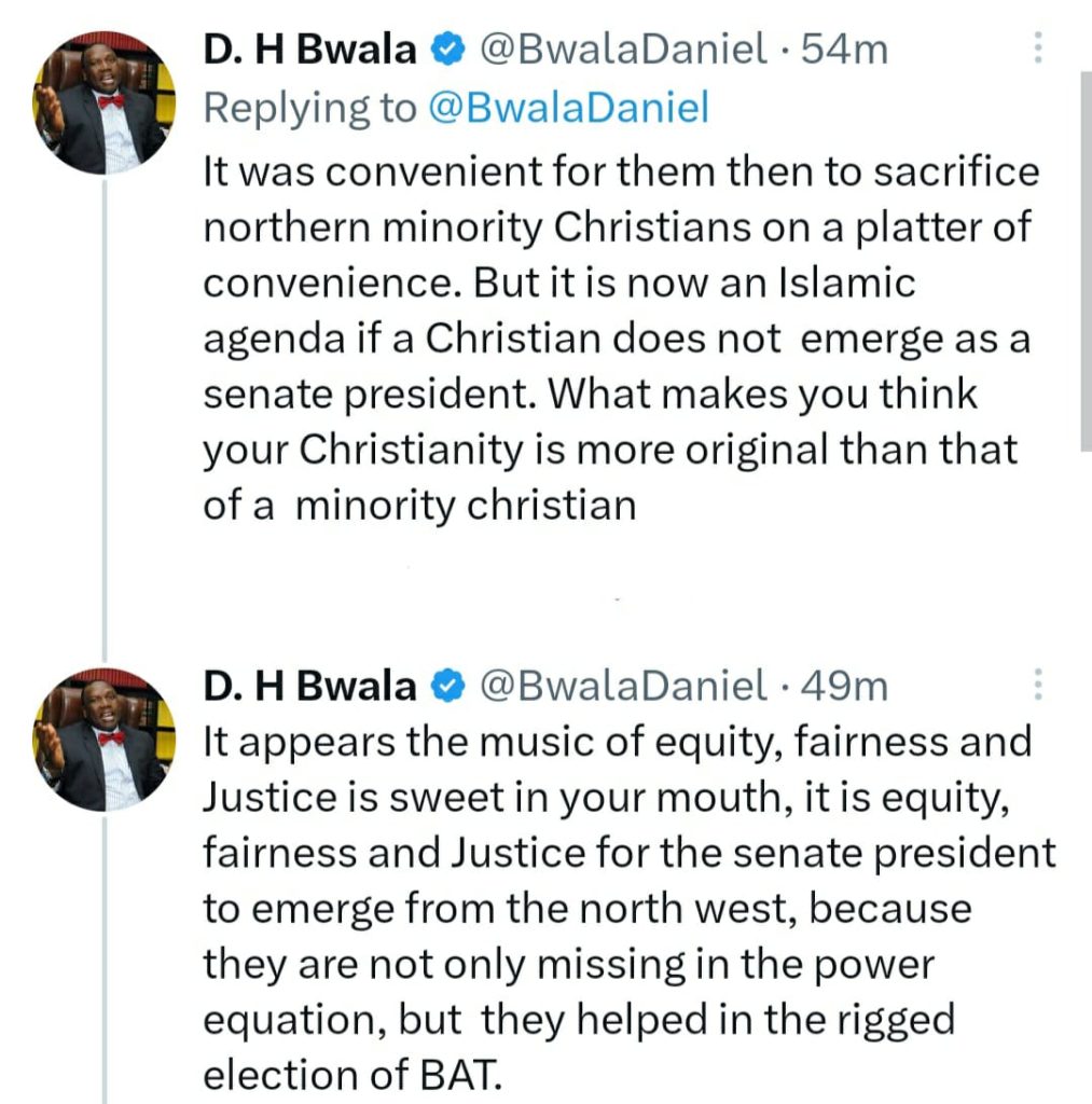 In a series of tweets, Bwala wrote that APC members who saw nothing wrong with the Muslim-Muslim ticket should also not complain if a Muslim is made Senate President because to them, religion doesn’t matter. See his tweets below